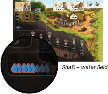 Excavated coal is stored in the courtyard area on the player board. If there is more than 1 pit water in the pit, he must remove it first.