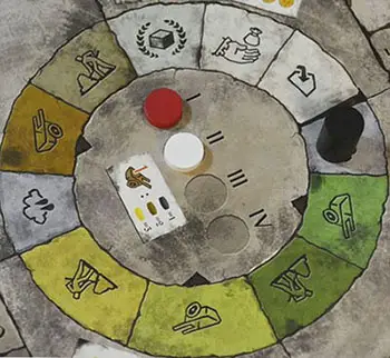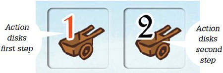 Depending on the number of players a number of action disks are used and placed in the drawing bag as shown in the example on the left.