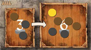 Randomly draw the action disks from the bag without looking at them. At first, for each reserve pool, draw 3 action disks and place them on the reserve pools. Then, for each action pool, draw 6 disks from the bag and place them on the action pools.