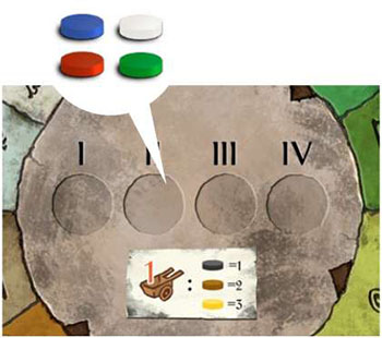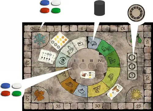 Before starting the first round the players randomly determine the turn order. Once the turn order has been determined they place their player disks in the correct order on the turn order chart.