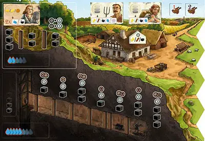 Each player receives 18 coal cubes, 11 player disks in one color and a player board displaying workers, a farm and a mining area.