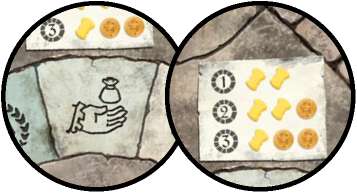 Each player must pay a lease for his lands to the nobility. During the first round you have to pay 2 food, the second year will cost you 2 food and 1 Thaler, the third year costs 2 Thalers and 1 food. The costs per year are displayed on the year wheel board.