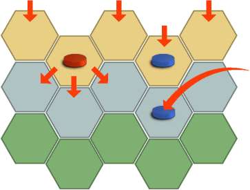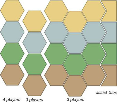 Depending on the number of players, the development board is formed from 12 to 20 hexagon tiles. The board will always contain four rows of 3-5 tiles of the same color. The assist tiles are placed alongside the development tiles.