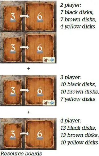 In the middle of the table, within reach of all players, a number of resource boards are placed. Take the resource boards where the player symbols are less than or equal to the number of players.