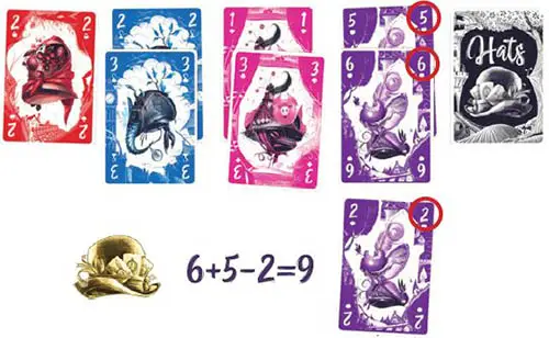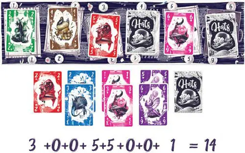 Players gain points equal to the sum of all cards in their collection that match the type of their "favorite hat" minus the value of the final card in their hand. The final card in a player's hand does not count as being part of the collection. This score can be a negative value.