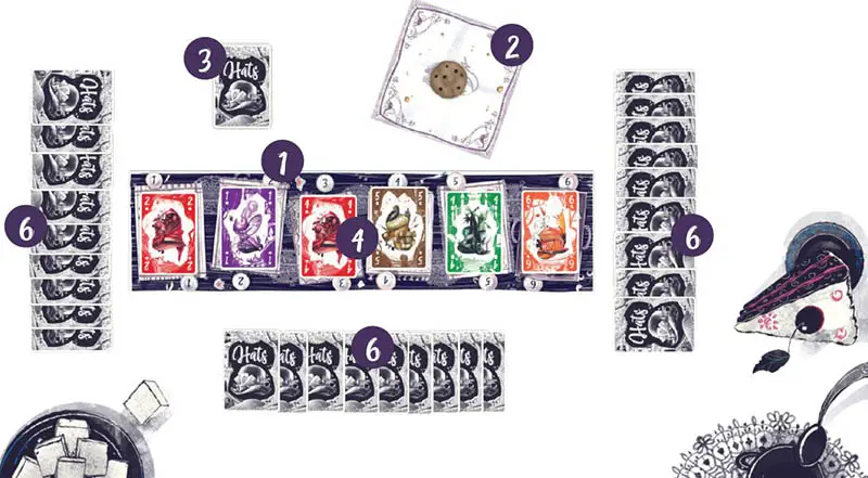 3 Shuffle all hat cards to form the draw deck and place it face down next to the tea table board.