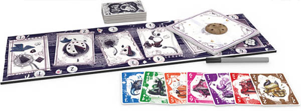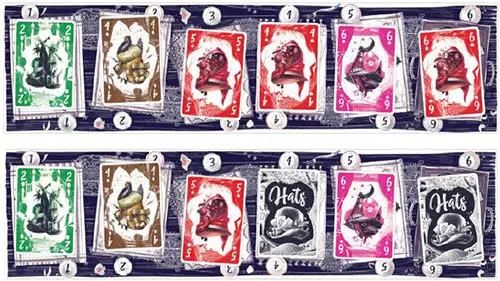 In Hats, two to four players compete to acquire the most outstanding hats by exchanging cards in hand with cards on the tea table board. Each card exchange influences how each hat is scored.