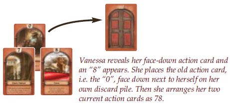 Vanessa reveals her face-down action card and an "8" appears. She places the old action card, i.e. the "0", face down next to herself on her own discard pile. Then she arranges her two current action cards as 78.