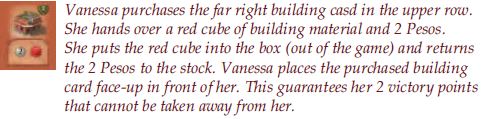 If a player purchases a building, he may choose to pay 5 Pesos instead of a worker (back to the stock). Also, 5 gray building material cubes (debris) can be paid instead of any one colored cube of building material (removed from the game to the box). Note: It is not possible to swap workers for Pesos or colored building materials for gray building materials!