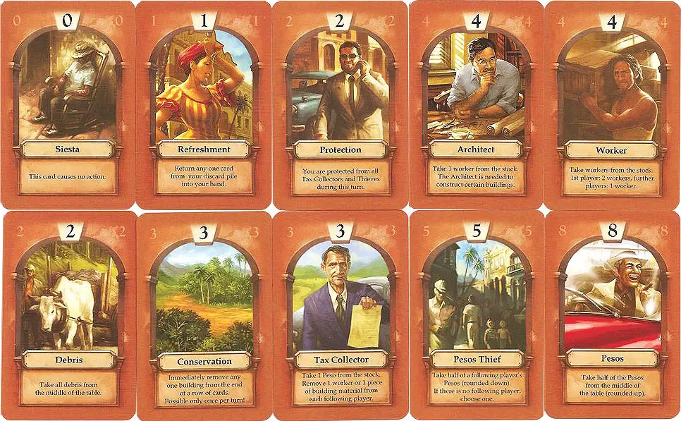 The order of players is determined by the value of the laid-out cards. Would you rather have a siesta and rest for a while or buy some building materials at the black market? The more powerful cards are played only later in the turn.