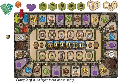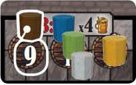 The 12 barrels in the centre of the main board display goals that you may achieve. If you have achieved one or more of these goals, you claim the corresponding barrels when you move to a barrel space. Barrels grant additional victory points at the end of the game.