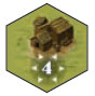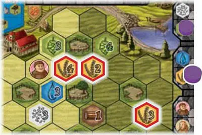 /Example Peter moves his player figure to a resource space that contains one yellow resource tile with a fertility number of 3 and one green resource tile with a fertility number of 5.