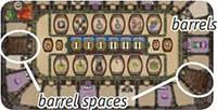 on the main board.Take the 12 small barrels and place 1 face up on to each barrel spot on the main board. Then place each of the large barrels on top of its matching small barrel.