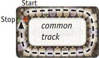 On your turn, move your player figure forward (clockwise) on the common track of the main board any number of spaces, but not further than the starting area (see the box on the right).