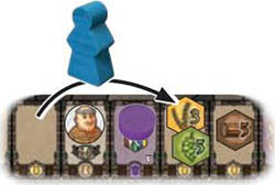 If you move your player figure to a scoring disc space on the common track, take 1 scoring disc from that space, place it on an empty tile-scoring spot of your player board and perform that spot's specific tile scoring action. The space from which you take the disc (A, B, Cor A/B/C) determines which scoring spot you may place it on.