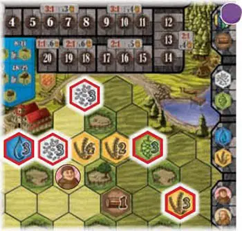 Peter moves his player figure to scoring disc space A, takes its scoring disc and places it on his x-tile scoring spot. He chooses to score fertility number 3 and this activates each of his resource tiles that has a fertility number of 3 (highlighted by a red border).