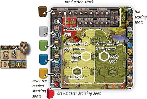 You have two more tools to achieve your aim of brewing the best beer: the 7 shed spots and the 5 privilege pairs on your player board.