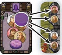 Peter places a scoring disc on the tile scoring spot of this monk. Thus each of his monks of this type is triggered and activates each tile directly adjacent to it (highlighted by a red border). The blue re source tile is activated twice.