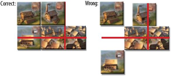 The three buildings that the player receives at the beginning of the game, can be placed anywhere provided they obey the above placement rules. (It is recommended however, to place them all in one quarter of the village).