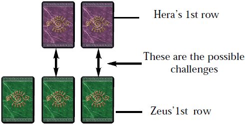 Only cards in the players' first rows may challenge (except Pegasus) or be challenged Io, Argus, Medusa, and Pandora may never initiate a challenge.
