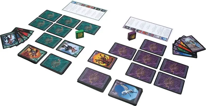 One player takes the role and cards of Hera (violet) and the other player takes the role and cards of Zeus (green).