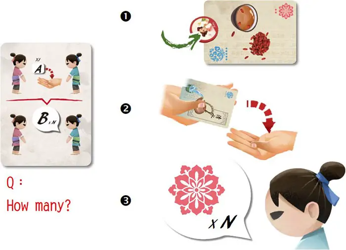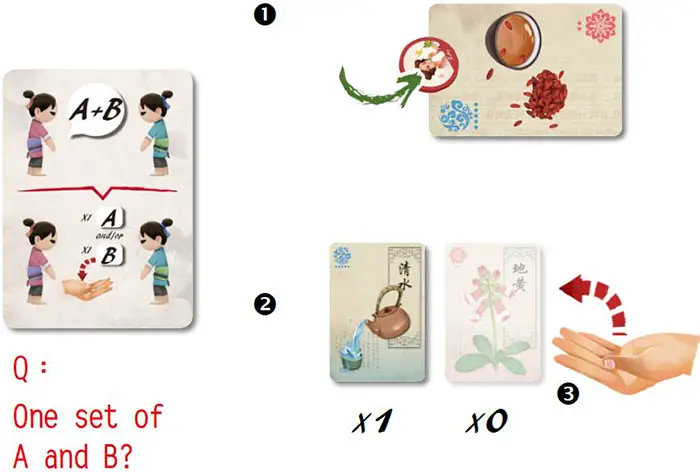 Example: 1 Amy has a medicine marker on the Red-Blue medicine card and chooses Bob, 2 Bob has to give Amy a red and a blue ingredient card. 3 Bob doesn't have any red ingredient card, so he only gives 1 blue ingredient card to Amy.