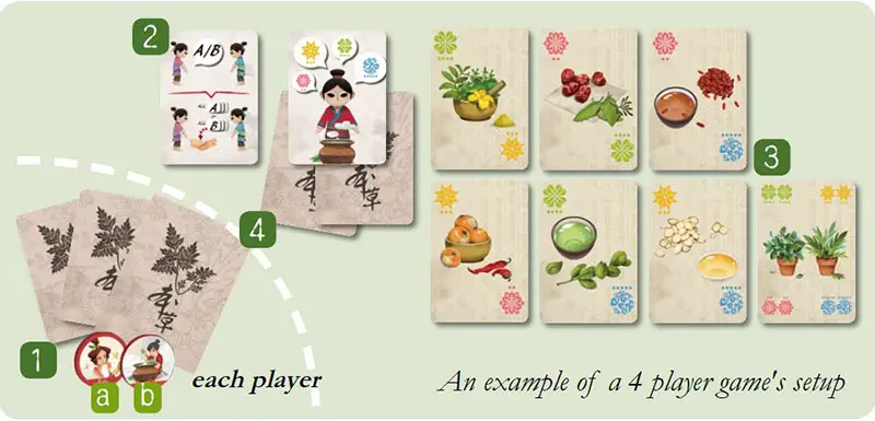 4 Shuffle the 14 ingredient cards face down, and randomly place 2 of them face down under the "curing" action card. Distribute the remaining 12 cards evenly among the players, forming their starting hands. A player's hand is hidden information, and may not be revealed to the other players.