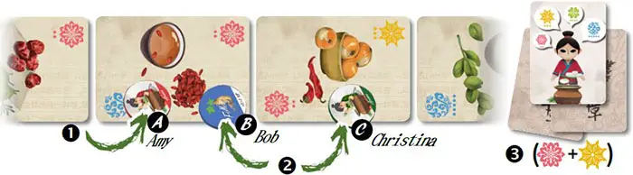 Beginning with the start player and going clockwise, each player performs the following 2 steps during his or her turn: