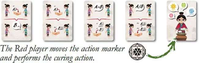 Example: 1 Amy has seen more than enough, and puts her cure marker on the Red-Blue medicine card (she is really fond of that card, isn't she?). 2 In clockwise order, Bob and Christina decide whether or not to use their cure markers now as well.