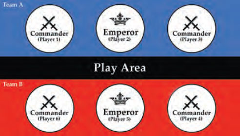 Players split into two teams of three, with each team choosing one player to be their Emperor. (If using two Character Packs, make those players the Emperors). The Emperors sit facing each other, flanked by their teammates (Commanders) on either side.