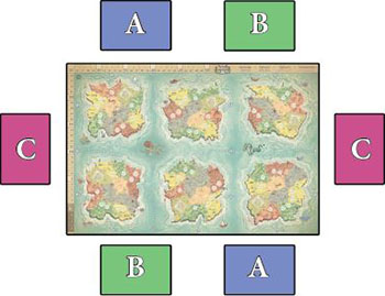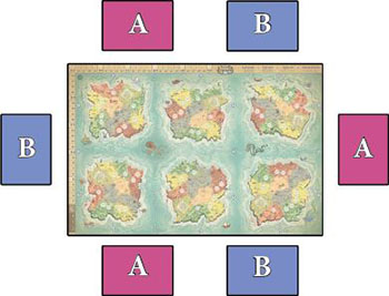 Players should decide their alliances before starting the game. These alliances will be permanent and cannot be broken. Members of the same alliance should not sit next to each other, and their seats should be alternated. So, the seating order should look like this: