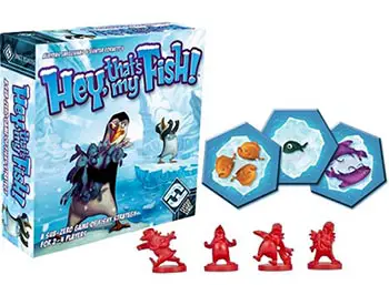 In Hey, That's My Fish!, 2-4 players move their penguins on the ice floe tiles, collecting fish. The player who has collected the most fish by the end of the game wins.