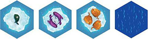 These 60 hexagonal tiles each depict an ice floe with 1-3 fish on the front side and empty water on the back side.