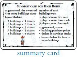 As before, the player with the most thalers at the end is the winner. Players add together the thalers from the earnings stack, the bonus, and those invested in the buildings.