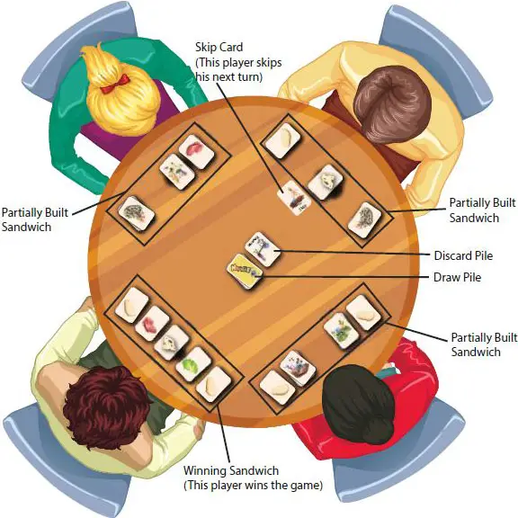 Skip any players next turn by placing a Skip card face up in front his or her sandwich.