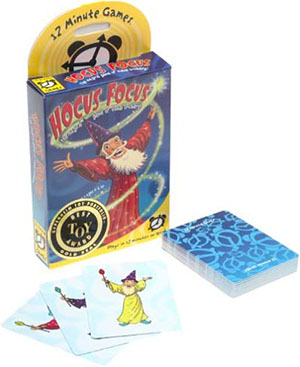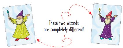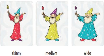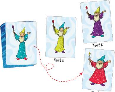 Before playing, take some time to look over the cards. Notice that the wizards come in three different sizes (skinny, medium and wide) and that their hats, wands, robes and shoes are four different colors (red, purple, green and turquoise).