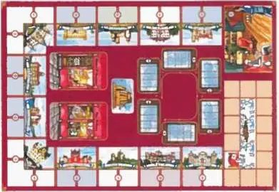 The game board shows the interior of the 'Antique Club'. Players start with their figures in the Club Room and head towards the prestigious Dinner Banquet On your way to the Dinner Banquet, you will pass Castles where the exhibitions take place. In between the individual spaces are octagonal areas that contain 2 numbers.