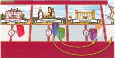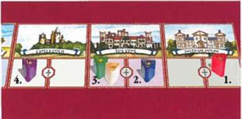 The two players with the most valuable and second-most valuable exhibit may now move their triangular game figures forward along the Castles of the score track.