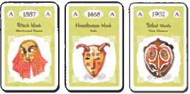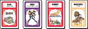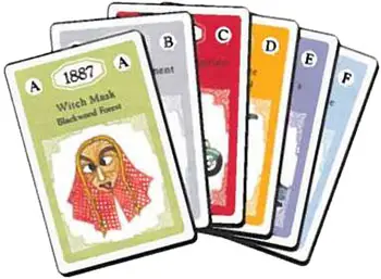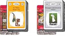 Collectibles cards show the objects of everyone's desire. These cards show all the different collectible items in six different categories (A-F). The ages of the objects are indicated on the top of the Collectibles cards the older an object, the more valuable it is. Players use these cards to put together an exhibit.