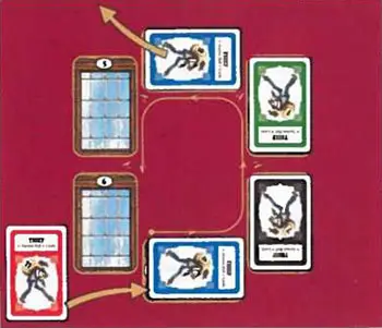Once a Thief moves out of the last prison cell, because of new Thieves entering the prison, the player who owns that Thief takes the card back into his hand. The player who regained his Thief may now use him again in future rounds.
