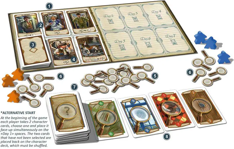 Next, place the 6 action markers standing on the character cards ready to start a new day of search.