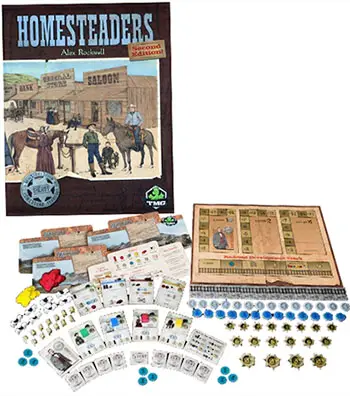 In Homesteaders, players are settlers in the Old West, claiming land to develop into a town. The player who contributes the most to building that town into a city will have the city named after him and be declared the winner.