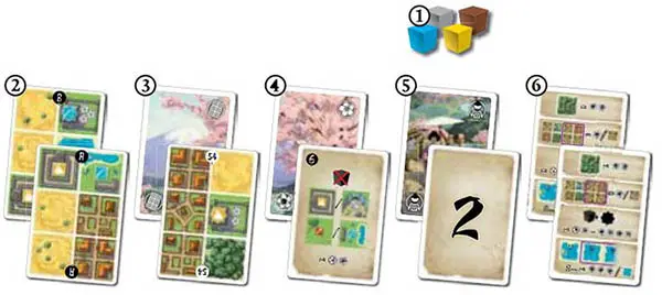 1 - 6 Starting Province cards (The A-sides are identical and guarantee an equal setup while the B-sides provide an asymmetric setup for the players).