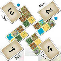 First, Map cards are played in a trick and the player who played the highest valued card gets to pick first from those played. Then the players use the Map cards picked to expand their personal maps. Each player must expand their personal maps to maximise their scoring possibilities.