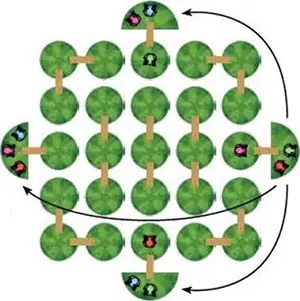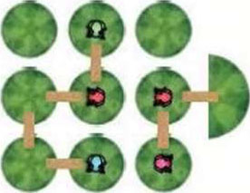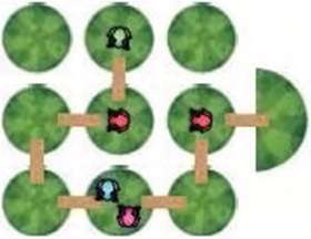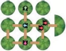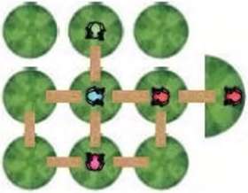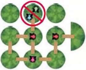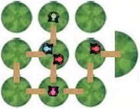 Hop! Jump! Hop! Jump! Frogs jump from leaf to leaf. They try as fast as possible to move to the home leaves of their opponents. After each frog jump the bridge which connects the two leaves disappears.
