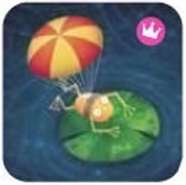 The player decides to jump down with the blue frog, onto the leaf with the pink frog.