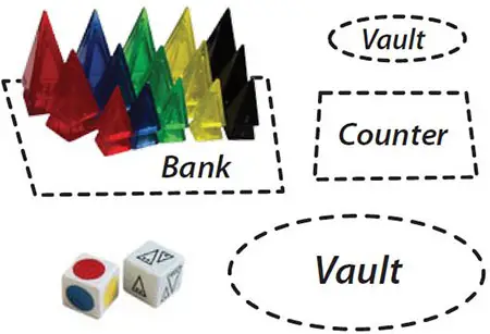 On your turn, roll both dice. Choose a piece of the size and color indicated, take it from the Bank, and place it on the Counter. You may or may not get to put this piece in your Vault when your turn ends.