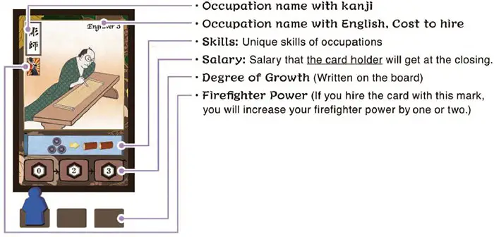 Second, when your Oyakata meeple goes around the main street. When your Oyakata meeple passes its starting point, all of occupation cards you hire on the board will grow by one degree immediately.