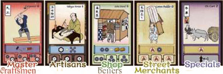 Cards are categorized by the color of its frame. (Master Craftsmen = Red, Artisans = Brown, Shop Sellers = Lime Green, Street Merchants = Cream, Specials=Purple)