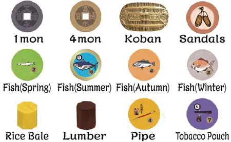 Koban (oval gold coin) Tokens: Used as a building material. Worth three IKI 1 mon points at the end of the game.